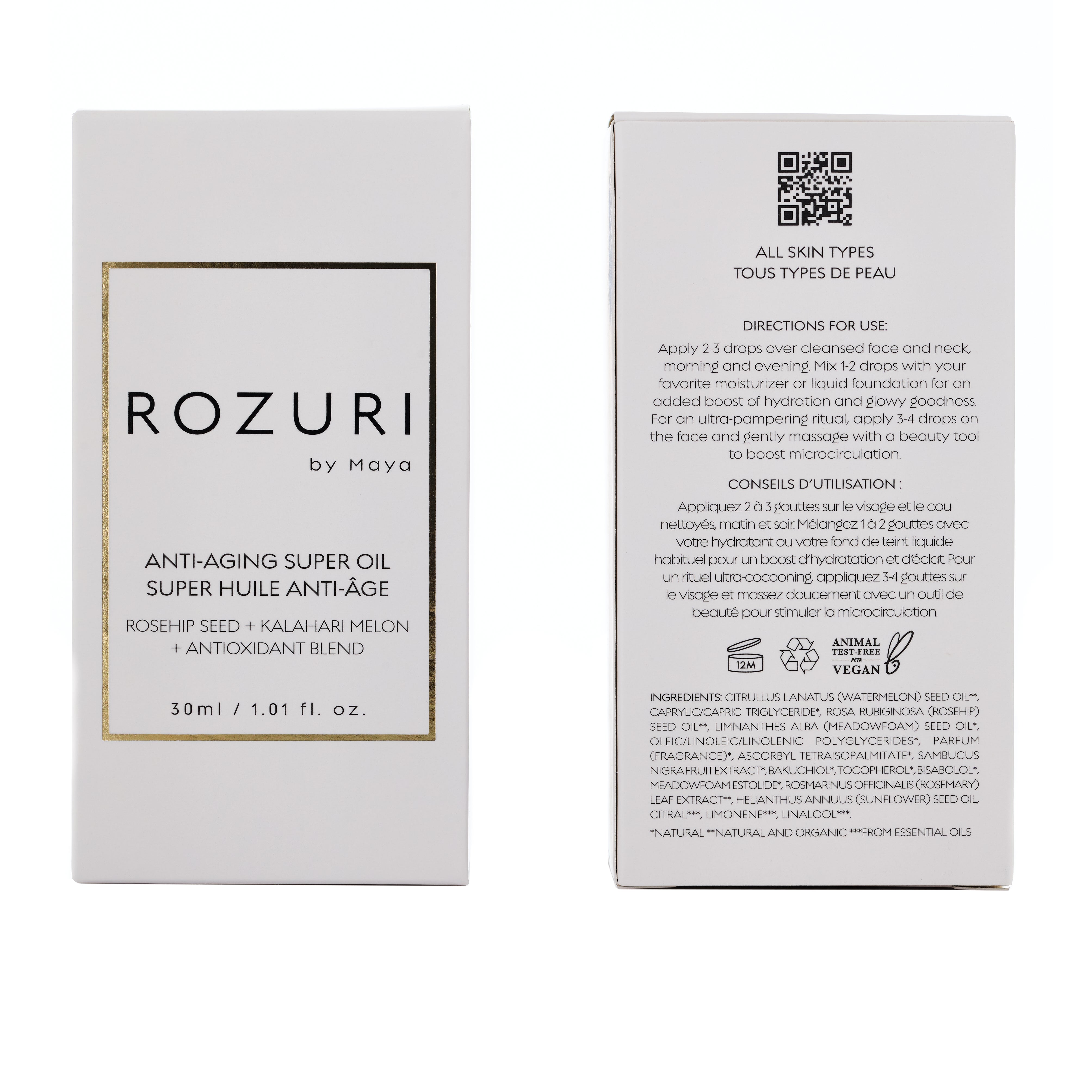 CITRULLUS LANATUS (WATERMELON) SEED OIL**, CAPRYLIC/CAPRIC TRIGLYCERIDE*, ROSA RUBIGINOSA (ROSEHIP) SEED OIL**, LIMNANTHES ALBA (MEADOWFOAM) SEED OIL*, OLEIC/LINOLEIC/LINOLENIC POLYGLYCERIDES*, PARFUM (FRAGRANCE)*, ASCORBYL TETRAISOPALMITATE*, SAMBUCUS NIGRA FRUIT EXTRACT*, BAKUCHIOL*, TOCOPHEROL*, BISABOLOL*, MEADOWFOAM ESTOLIDE*, ROSMARINUS OFFICINALIS (ROSEMARY) LEAF EXTRACT**, HELIANTHUS ANNUUS (SUNFLOWER) SEED OIL, CITRAL***, LIMONENE***, LINALOOL***. *NATURAL **NATURAL AND ORGANIC ***FROM ESSENTIAL OILS